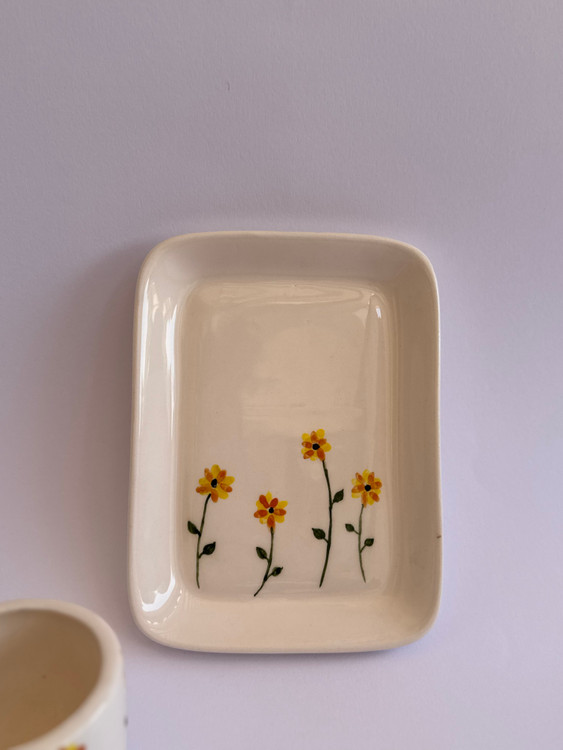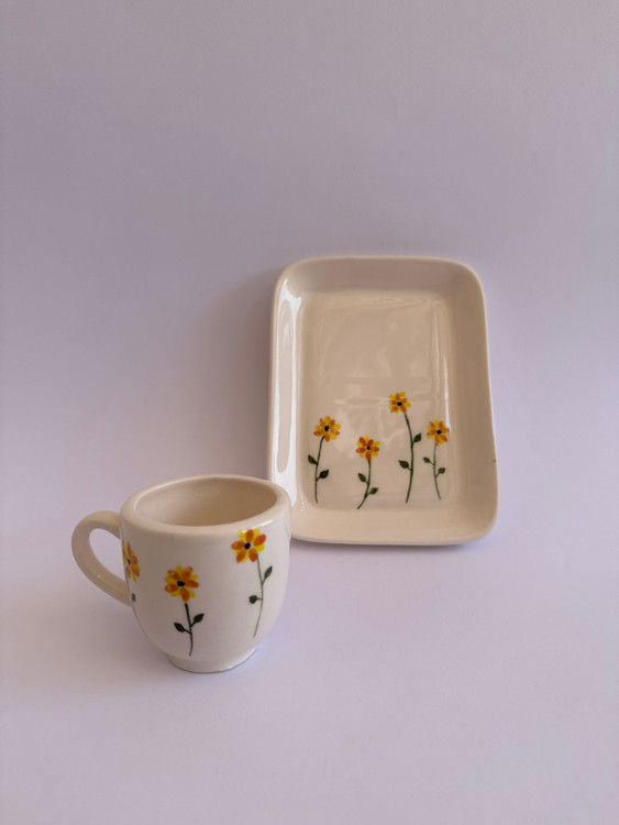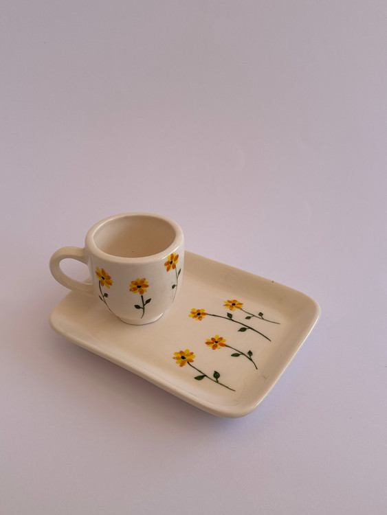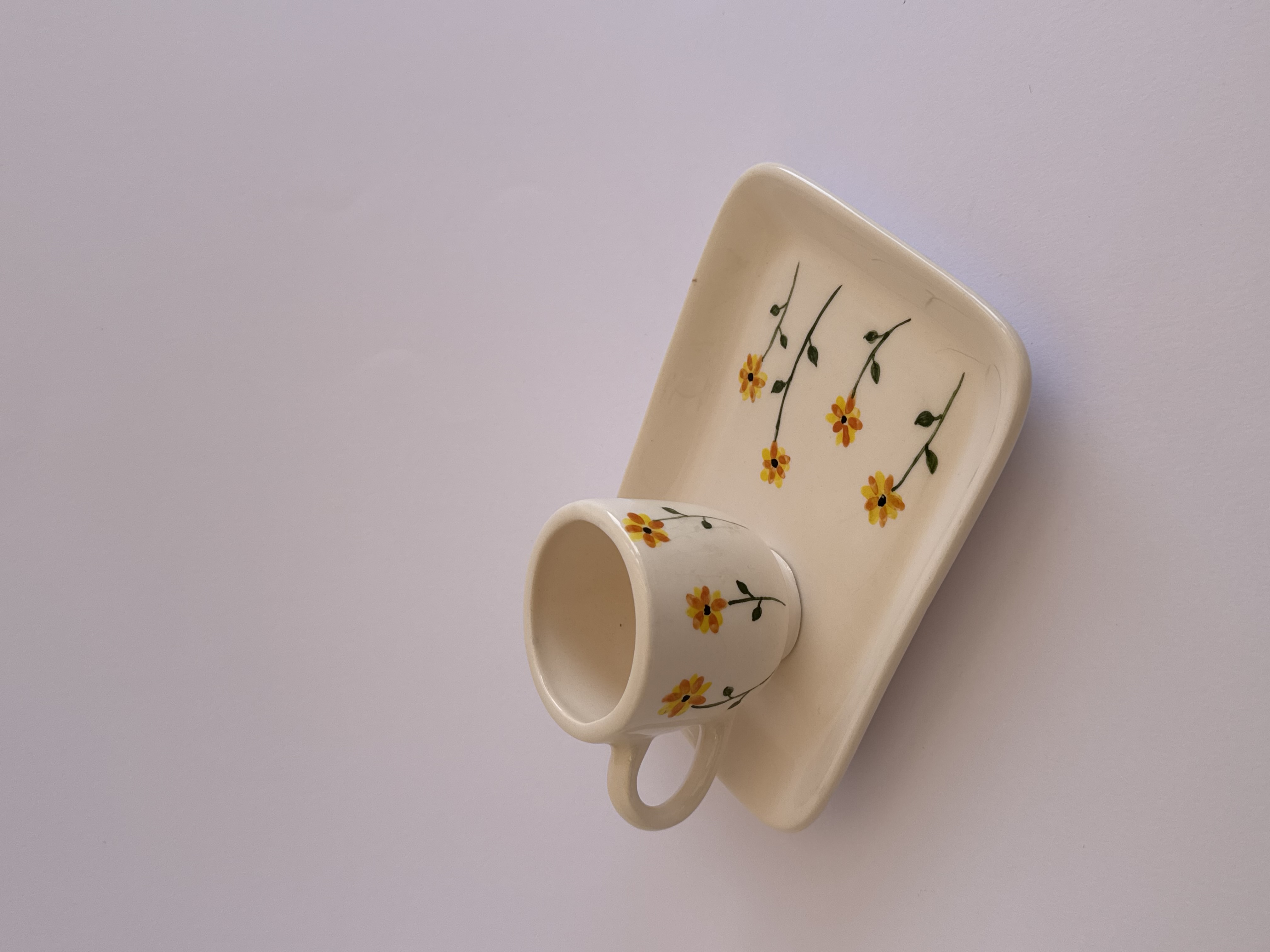 زیرشات و ماگ سفید با گل های افتابگردون نقاشی